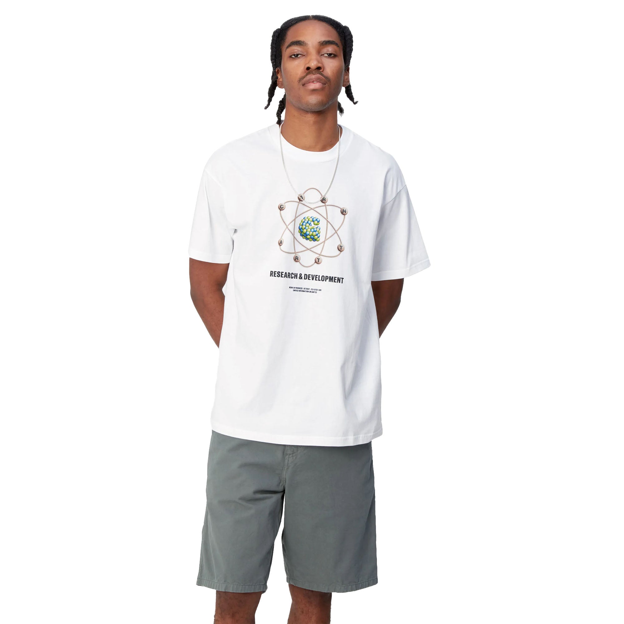 The Carhartt WIP R&D T-Shirt is woven from lightweight organic cotton jersey in a loose fit. A graphic print appears on the front.
